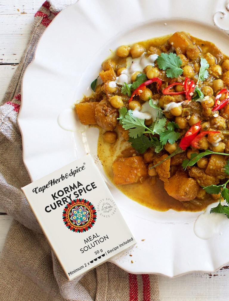 To make the korma: Fry the onions over medium heat in vegetable oil until soft. Add the ginger and garlic and fry for a further minute. Add the Cape Herb & Spice Korma Spice and fry for a further minute. Add the coconut milk, tomato, salt, chilli, water and butternut. Cover with a lid and simmer over low heat until the butternut is soft, then add the chickpeas and warm through.