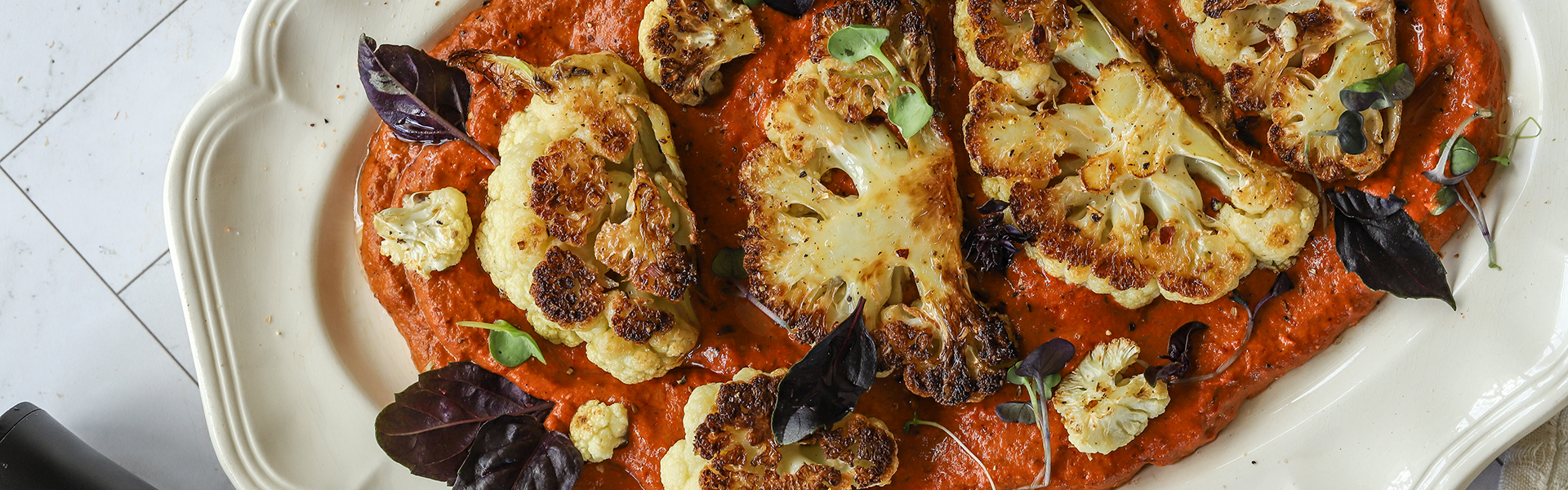 A bold, plant-forward dish that proves cauliflower can be the star of the plate. These golden-roasted cauliflower steaks are seasoned to perfection and served on a silky, flavour-packed creamy red pepper dip with toasted almonds, tahini and a hint of lemon. Finished with fresh herbs and a final sprinkle of BBQ spice, it’s an impressive yet easy recipe that works beautifully as a main or a standout side.