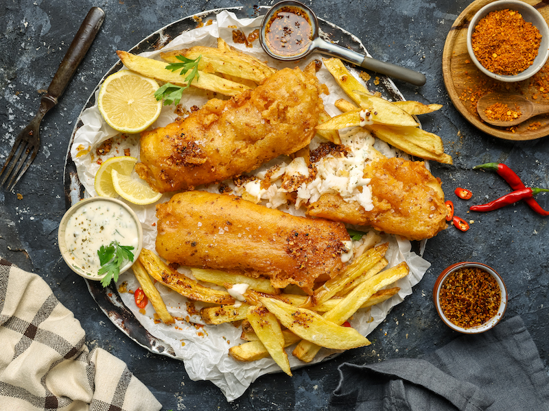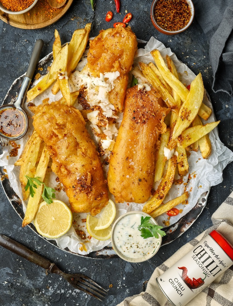 Fish & ChipsPour the oil into a large heavy-based pot to deep-fry the chips and fish. Heat to 350 °F.Pat the potatoes dry. Fry in batches for 10–15 minutes until cooked and golden. Drain on paper towel.Season a little extra flour with salt and pepper and lightly dust the Sea Harvest Cape Whiting fillets on both sides.In a mixing bowl, whisk together the cake flour, cornflour, baking powder, Cape Herb & Spice Chilli Crunch seasoning and cold beer until smooth. Season lightly with salt. Dip the fish into the batter and carefully lower into the hot oil. Fry for 5–8 minutes until crisp and cooked through.Drain well and repeat with all the fillets.Lemon Tartare SauceCombine the mayonnaise, yoghurt, mustard, lemon juice, capers and dill. Season and mix well.Chilli Crunch OilPlace the Cape Herb & Spice Chilli Crunch and garlic into a deep-sided heatproof bowl.Heat the olive oil until very hot, then carefully pour over and allow to infuse for 10 minutes.To ServeArrange the fish and chips on a lined platter.Serve with tartare sauce, lemon wedges and a drizzle of chilli crunch oil.Finish with fresh dill.