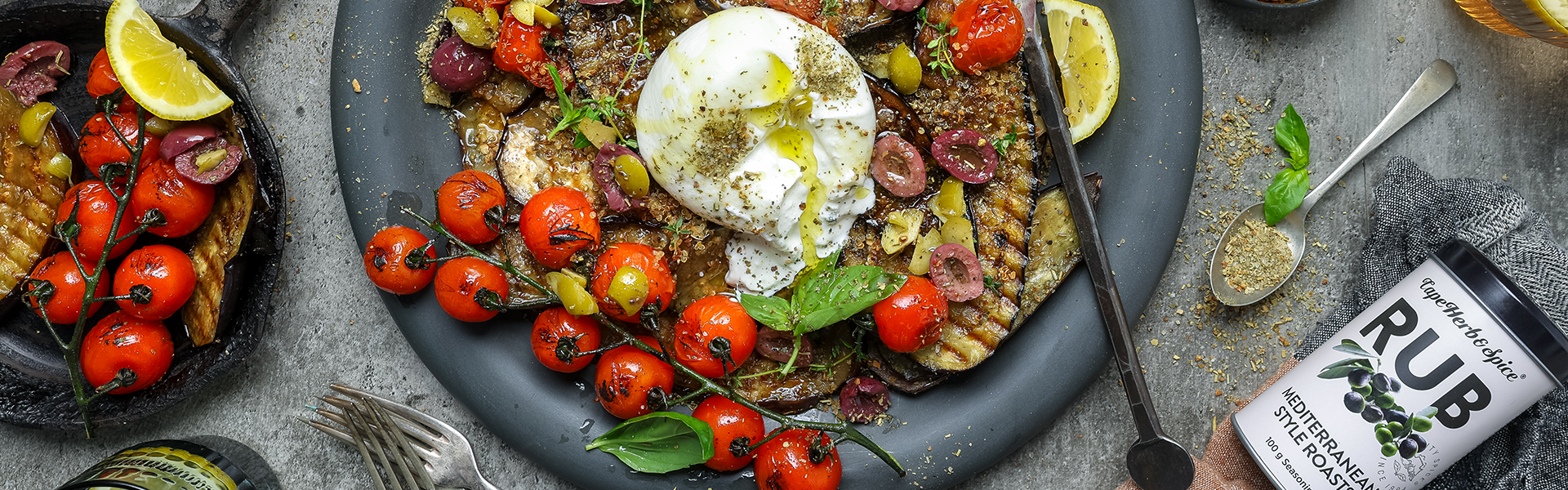 Slice the aubergines lengthways into 1 cm-thick slices. In a large bowl, combine the olive oil and Cape Herb & Spice Mediterranean Style Roasts Rub, then add the aubergines, mix to coat and allow to marinate for 10 minutes. Grill slices on a griddle pan for 4–5 minutes per side until tender and lightly charred.