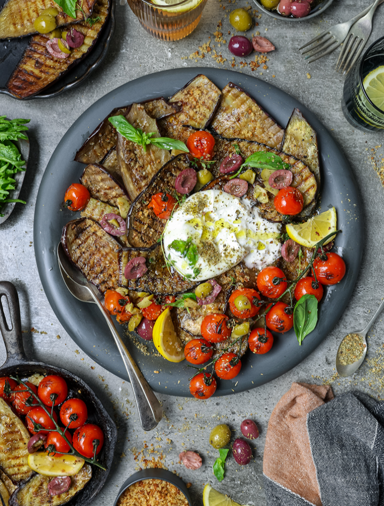 A delicious platter of charred aubergines and blistered tomatoes, served with creamy burrata, briny olives, and a sprinkle of crispy quinoa for crunch.