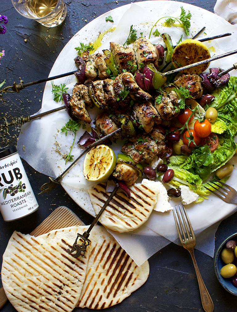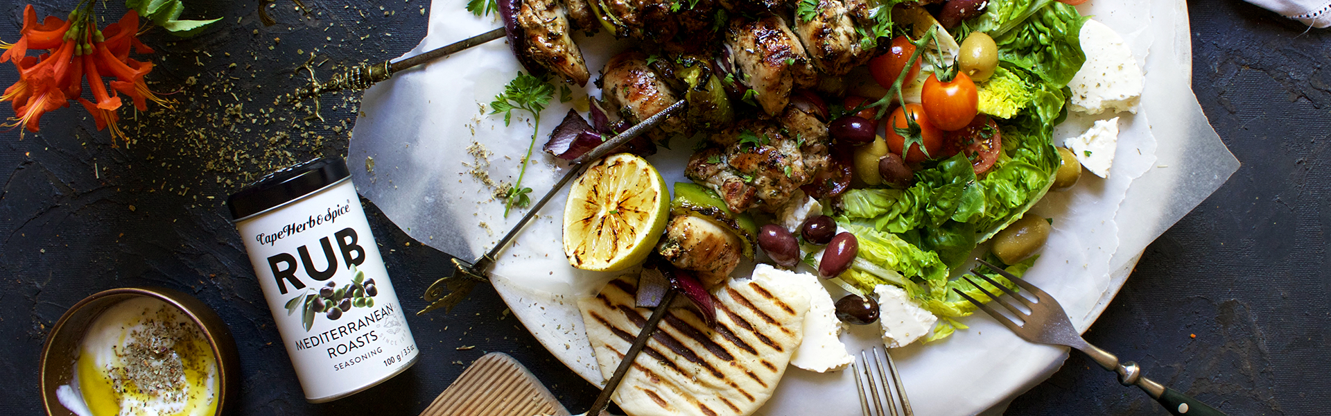 These plump, juicy chicken skewers are packed with the flavours of the Mediterranean … Olive oil, garlic, lemon and loads of herby punch care of our incredibly versatile Cape Herb & Spice Mediterranean Roasts Rub.