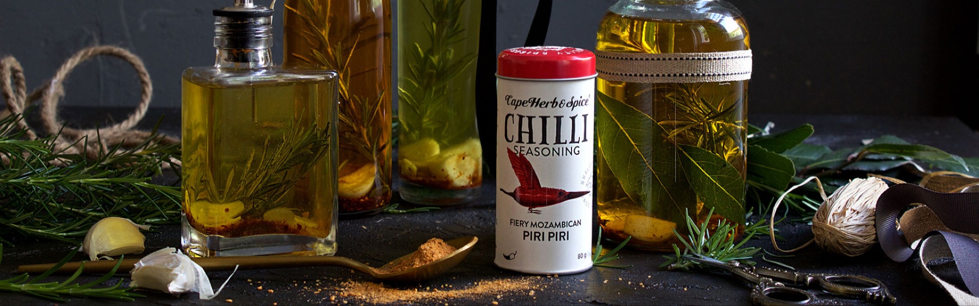 Flavoured oil is any keen cook’s go-to for an instant big flavour punch. This chillioil, using our Fiery Mozambican Piri Piri chilli seasoning, is so easy to make. Justa few ingredients and about two minutes is all it takes. Put it in a pretty bottlewith a ribbon, gift tag or sprig of foliage and it makes a brilliant gift for anyoccasion.This oil is so versatile. Drizzle it on pasta, steak, chicken breasts, grilled corn onthe cob, or even crostini! You could use 100% olive oil to make this chilli oil or gothe slightly pocket-friendlier route and use oil that’s a blend of olive and seedoils.