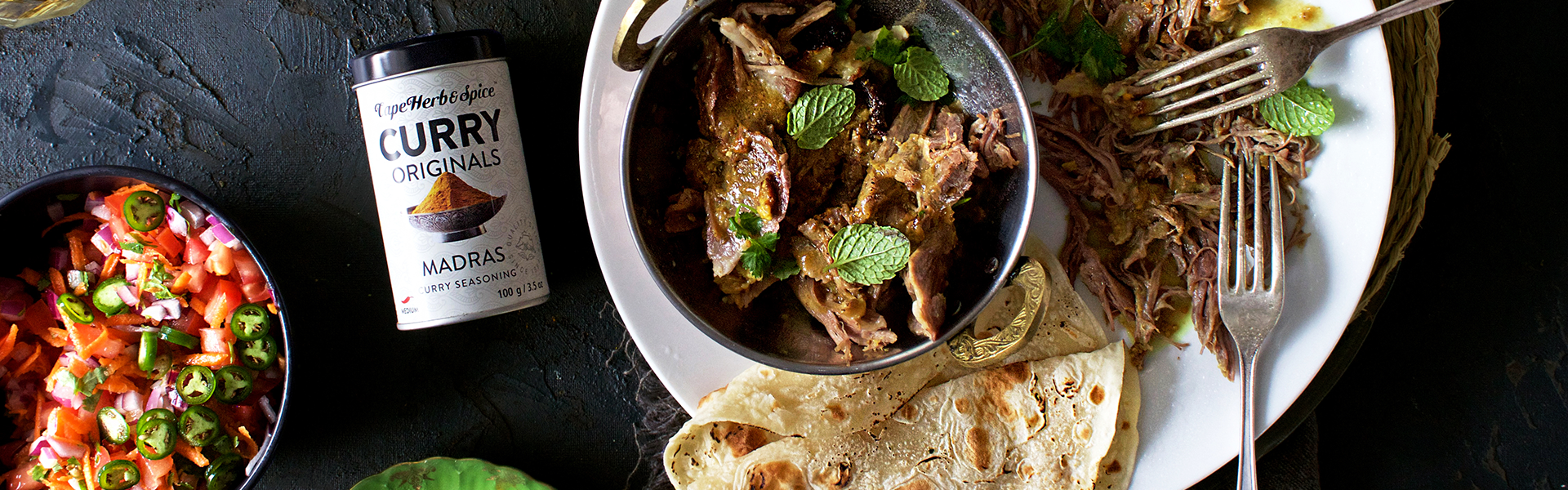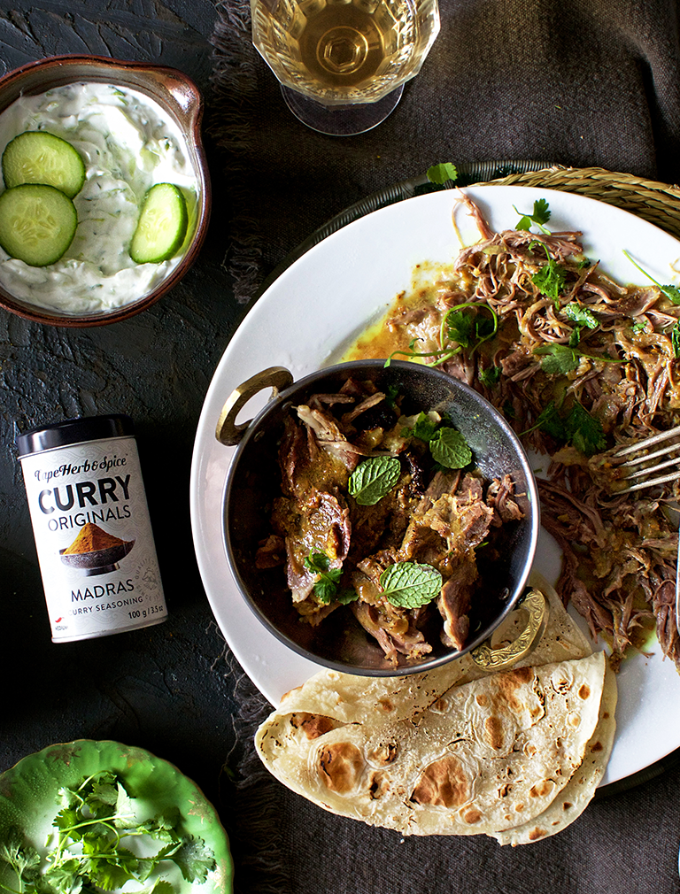 In the mood to entertain this winter? Our Madras shoulder of lamb hits the spot. It will feed a crowd of ten! Set a festive dinner table with plenty of glittering tealights and fun bright serviettes. Then load the table with warm, rich buttery rotis; chutney; raita and sambal and dig into pulled lamb gently flavoured with the spices of Madras.