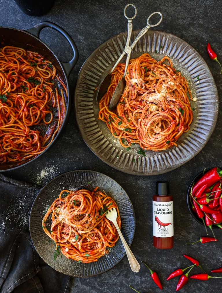 With the help of our NEW Chilli Liquid Seasoning, this Chilli Spaghetti Arrabbiata brings bold, fiery flavour - without the chopping, fuss or burning fingers. Simply drizzle, stir and simmer for a quick pasta that packs a punch. Because life’s too short for bland.