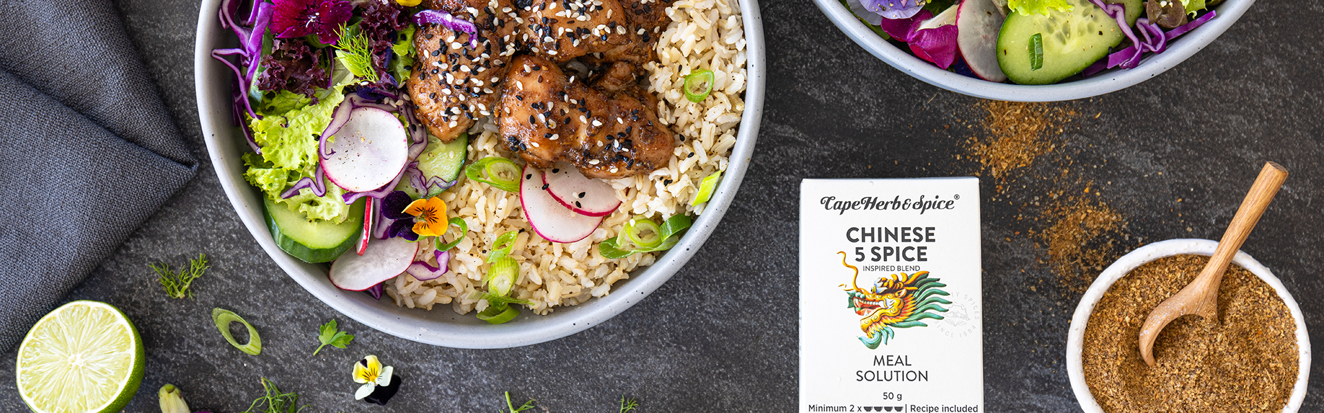 Give your next summer salad an oriental twist! Take your tastebuds on a trip to Asia with this delicious Sticky Chicken Salad Bowl, elevated with a shake of our aromatic Cape Herb & Spice Chinese 5 Spice meal solution.